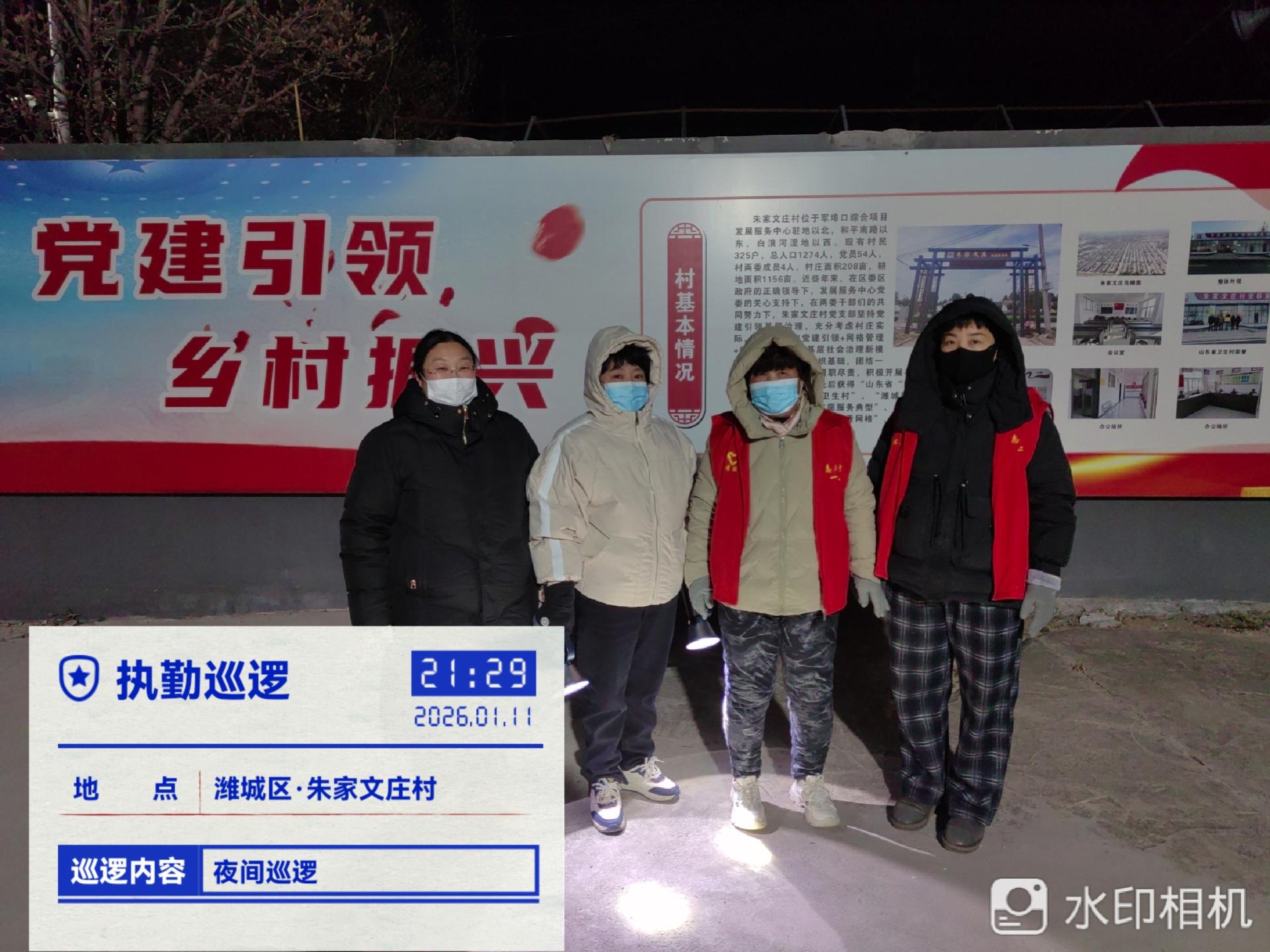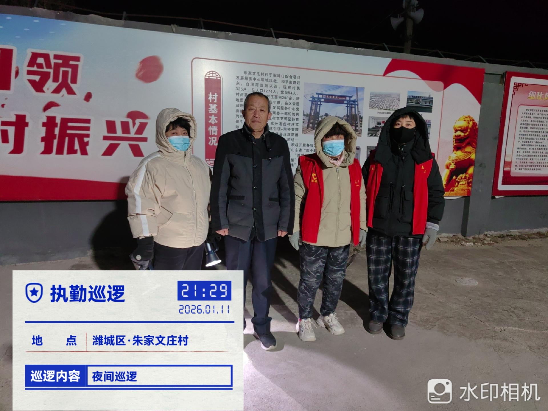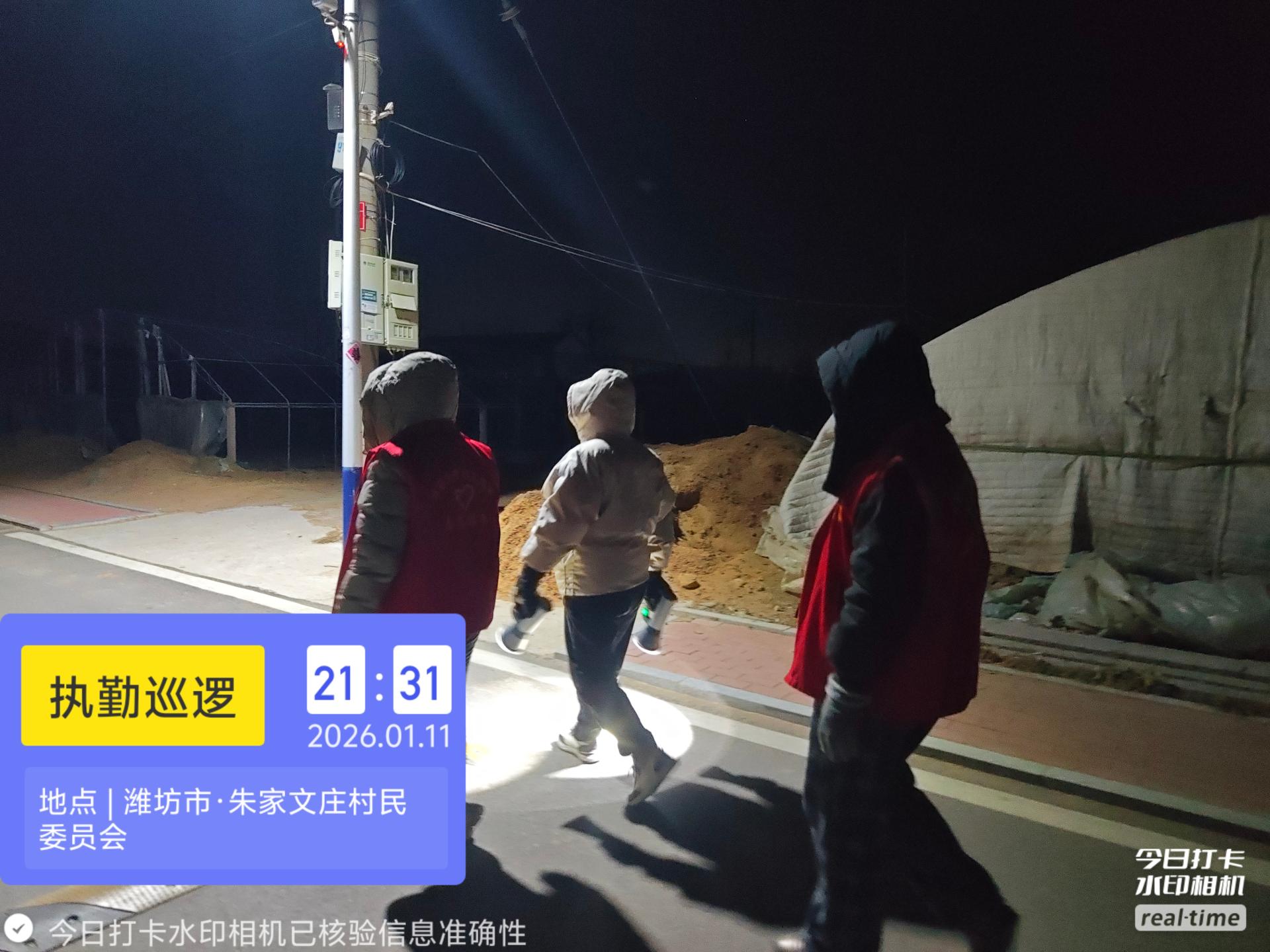 19:30-22:30朱家文庄村志愿服务队组织志愿者参与夜间值班巡逻活动,保障村民的财产和生命安全。