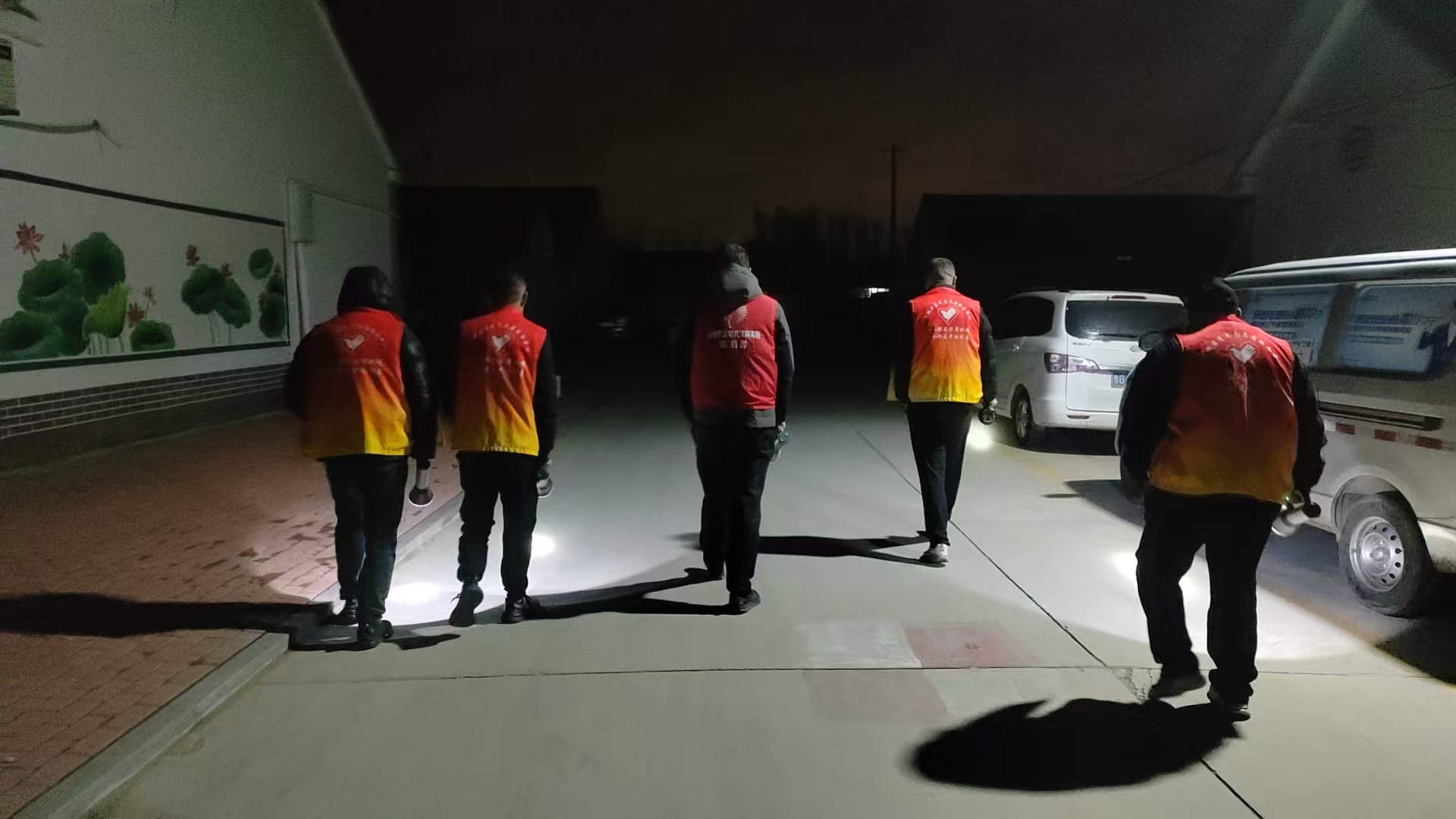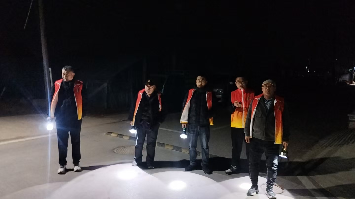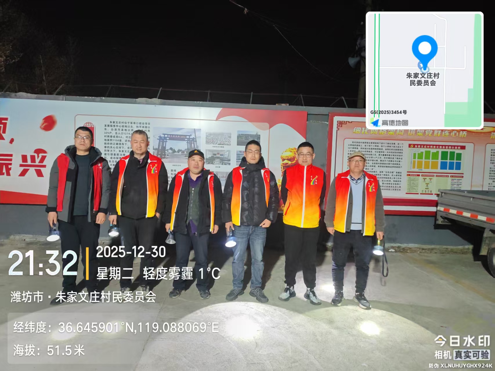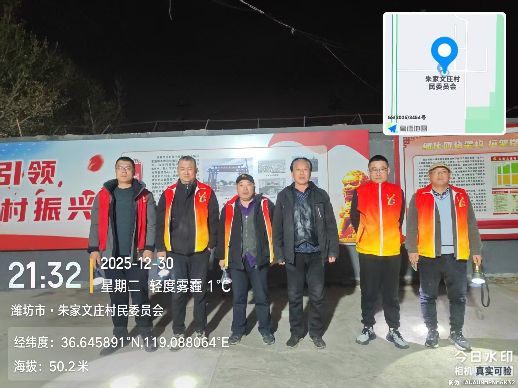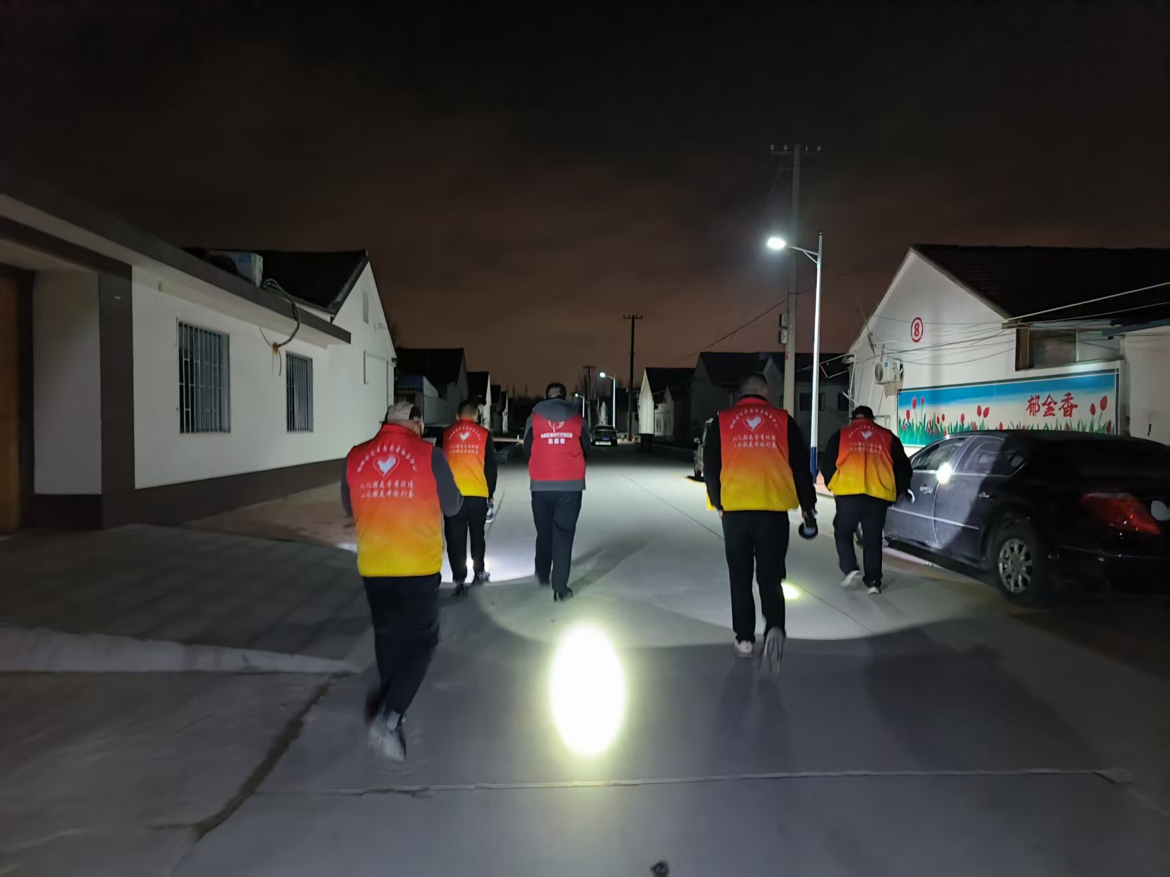 19:30-22:30朱家文庄村志愿服务队组织志愿者参与夜间值班巡逻活动,保障村民的财产和生命安全。