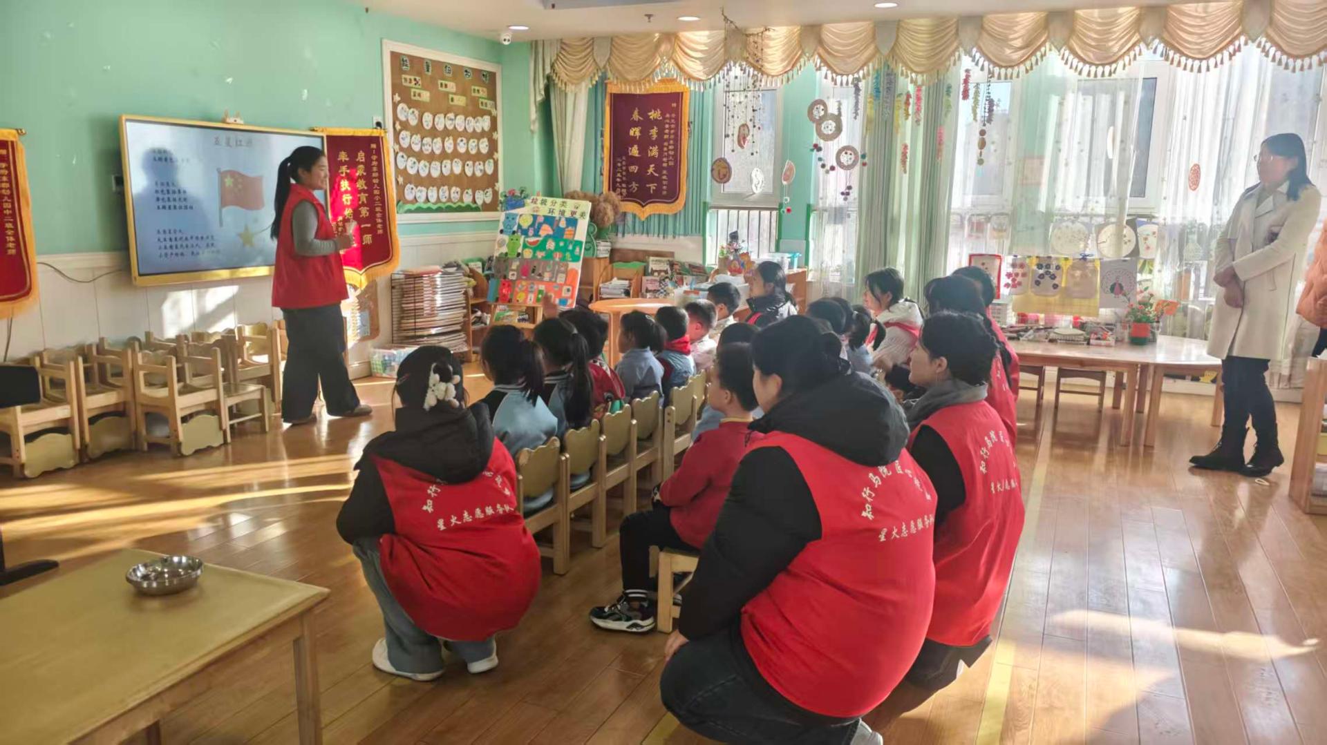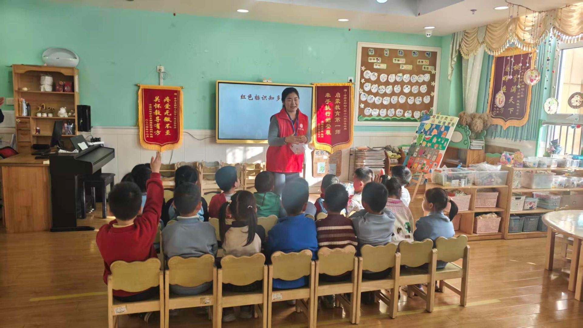 "印记小手绘,童心映光辉"活动旨在借手绘活动助幼儿识红色符号,弘扬红色精神。志愿者先以"大风吹"热场,讲解红色符号意义,再引导小朋友创作"我心中的红色印记",让小朋友分享画中故事 最后拼成"童心向红"长卷。
