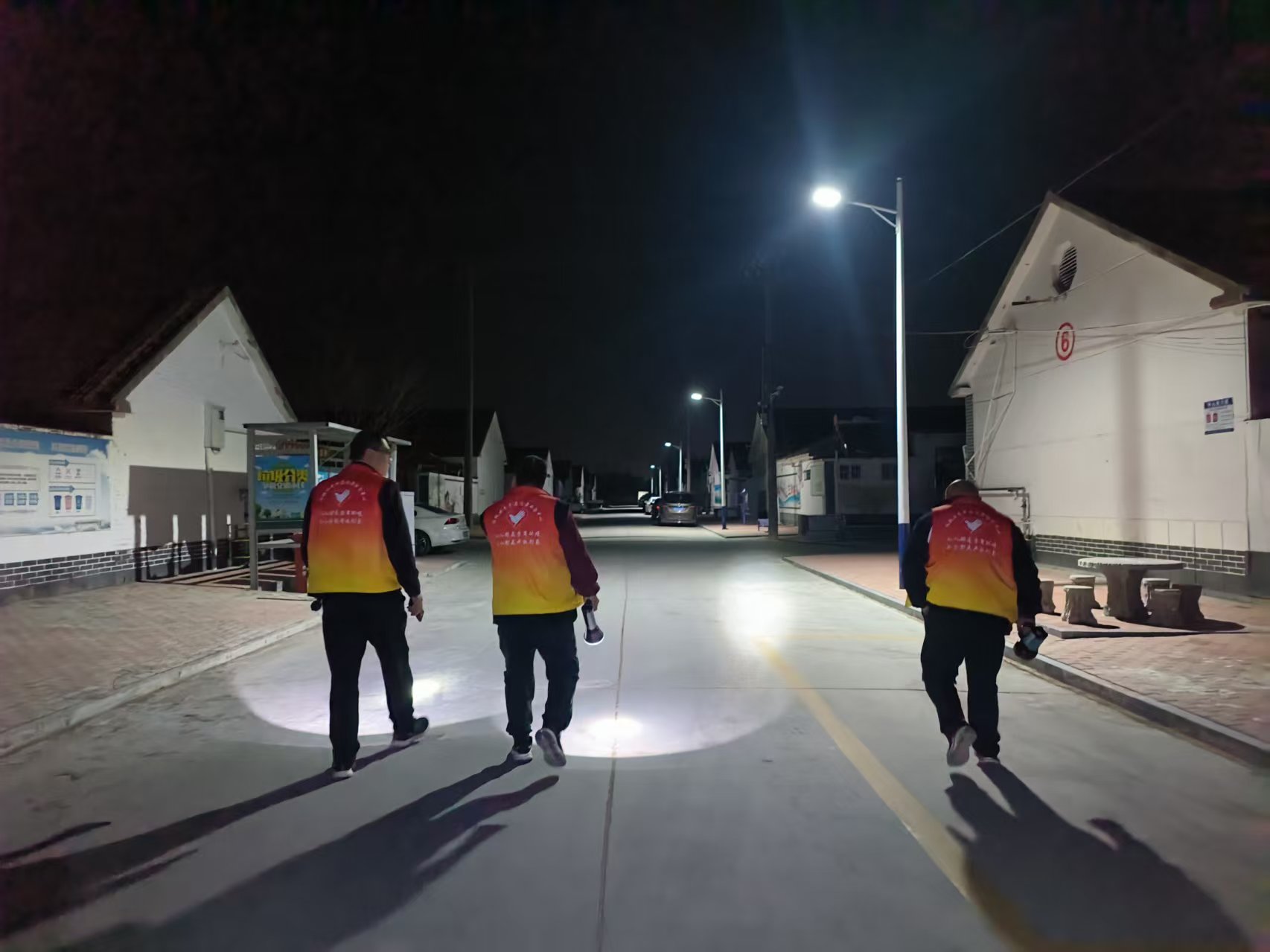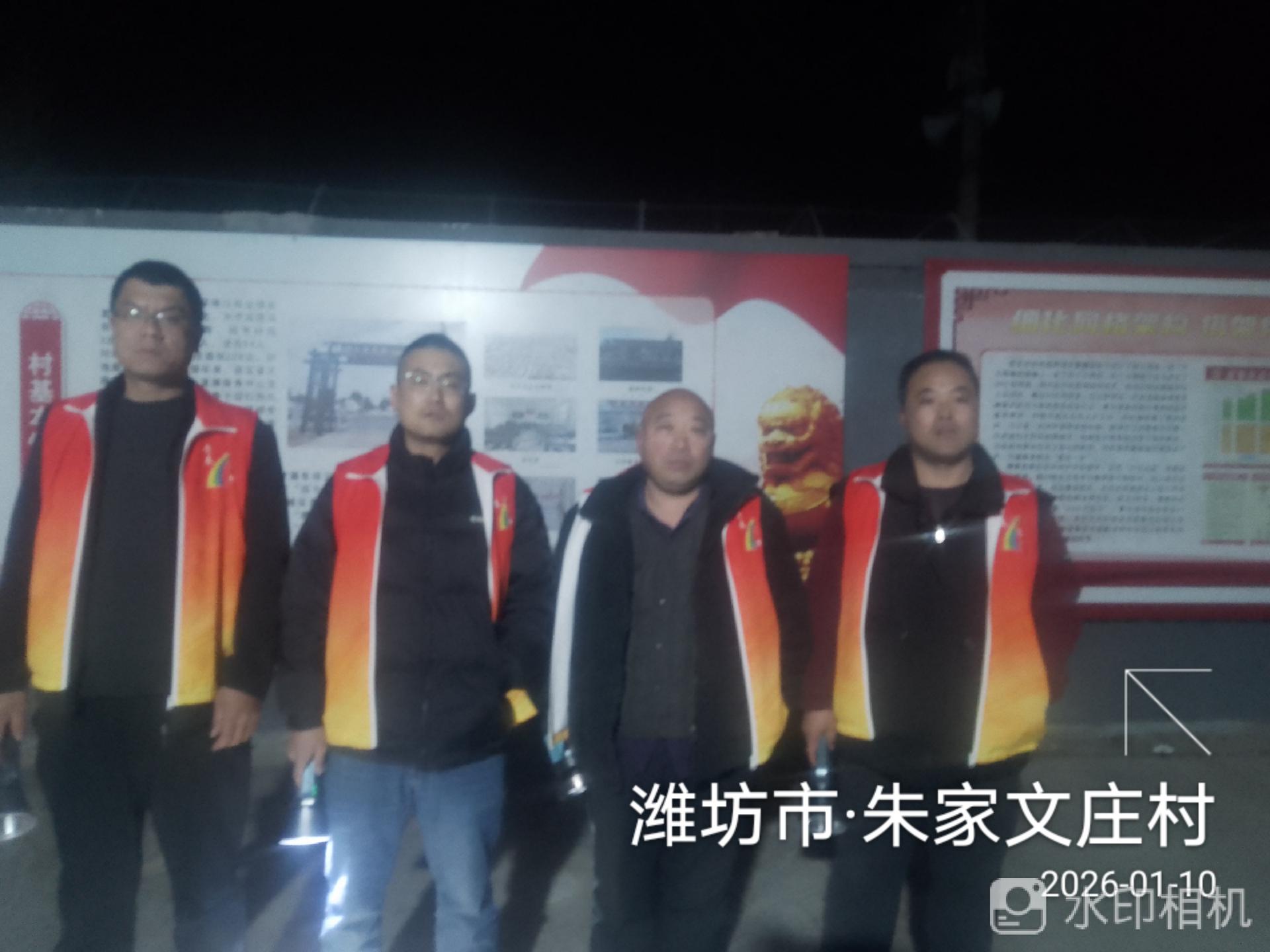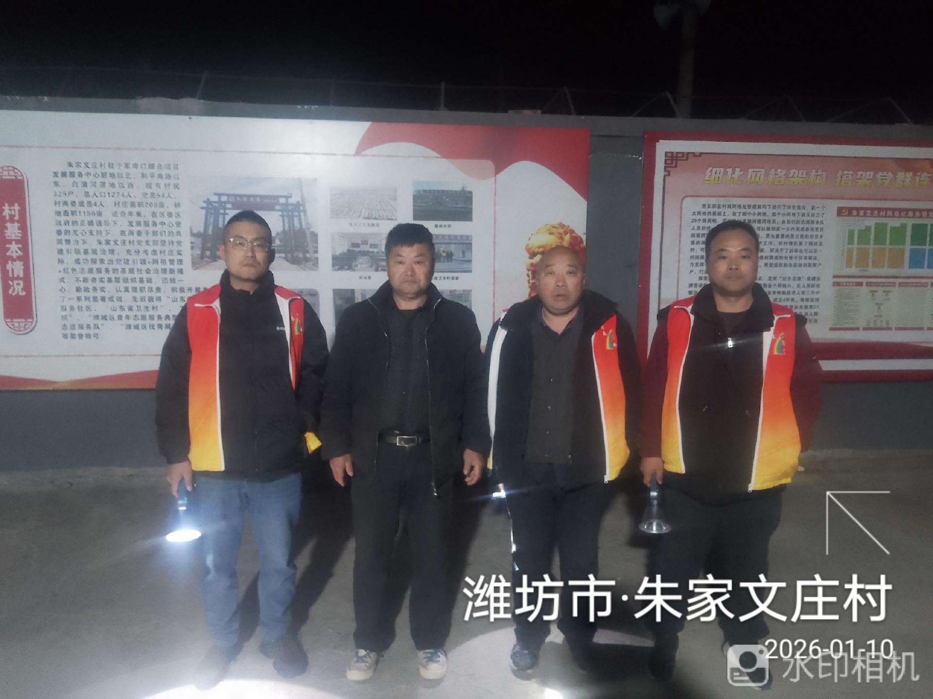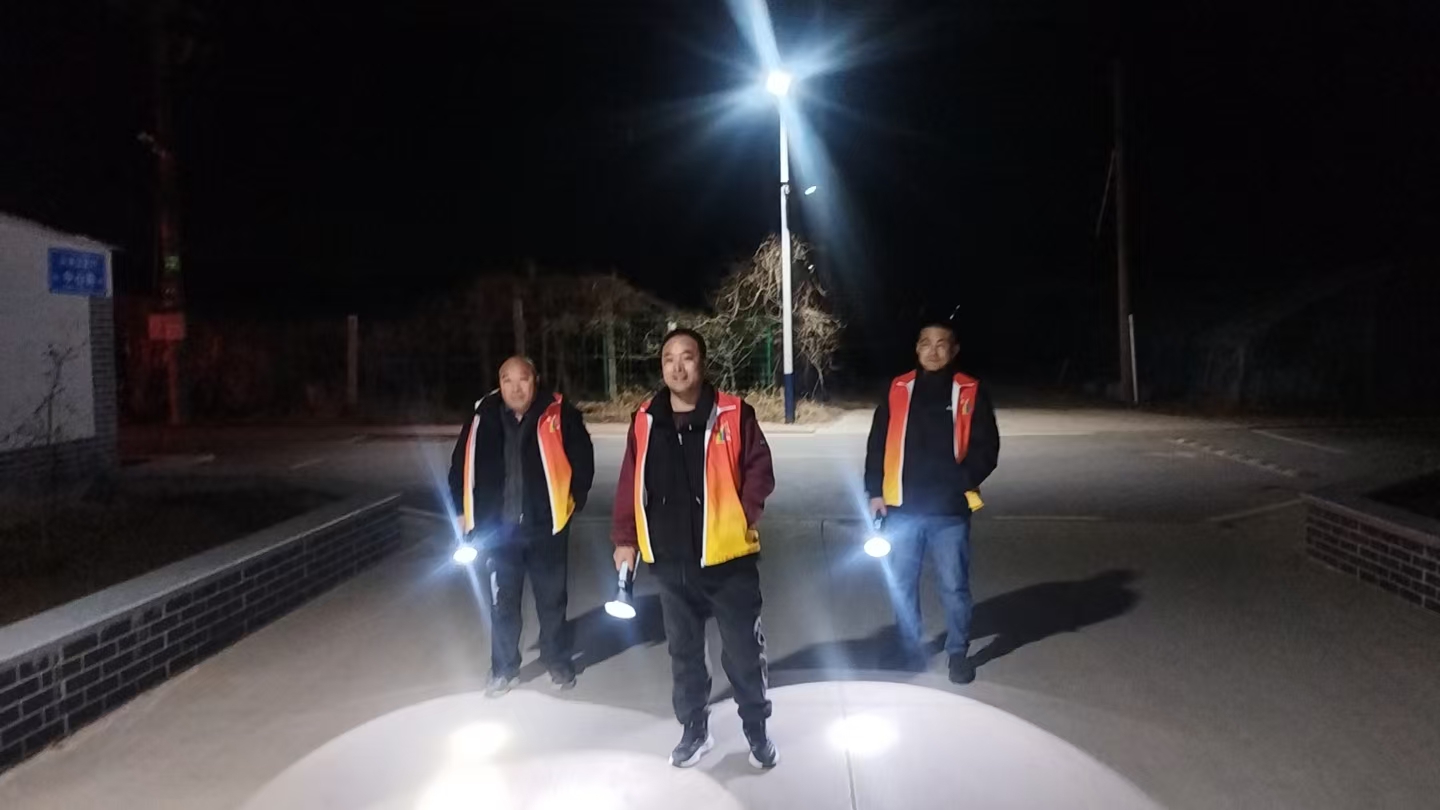 19:30-22:30朱家文庄村志愿服务队组织志愿者参与夜间值班巡逻活动,保障村民的财产和生命安全。