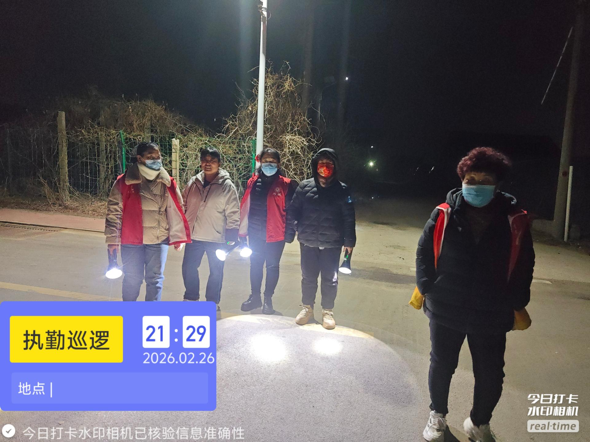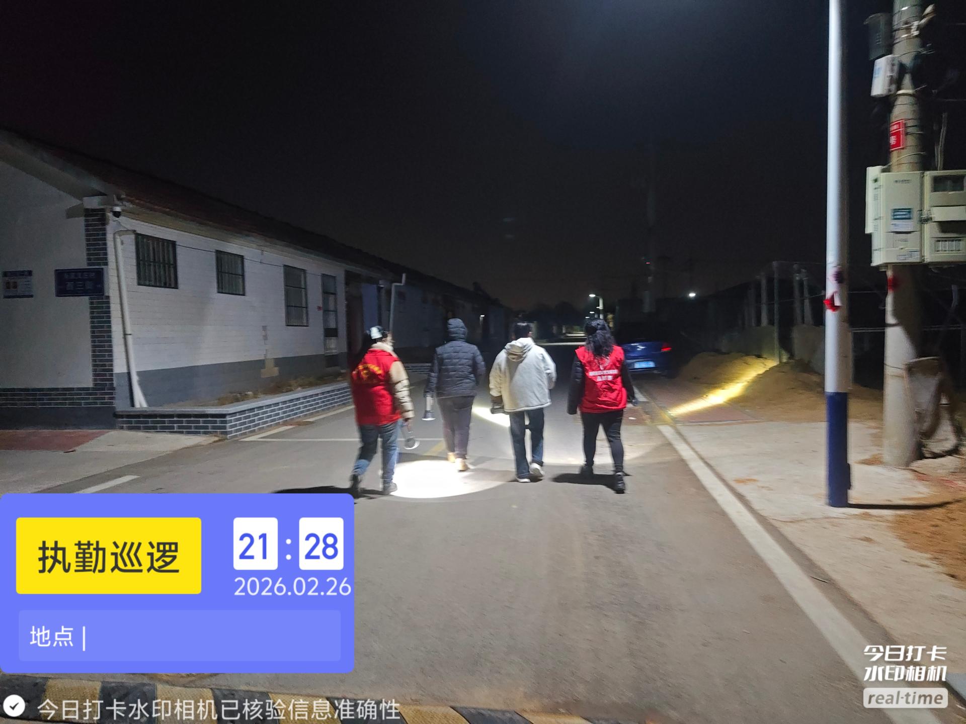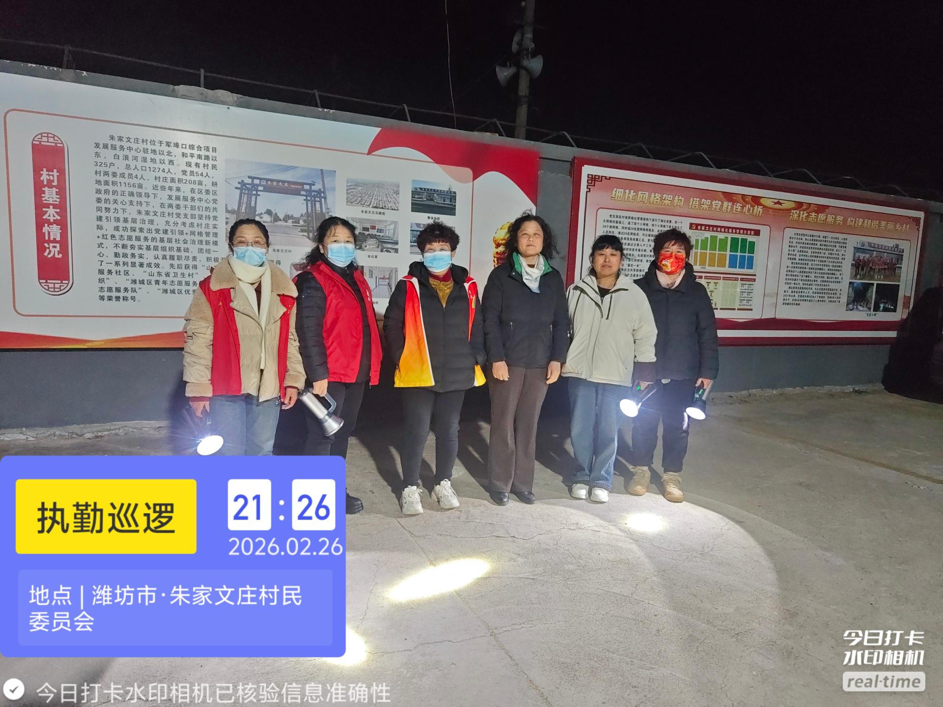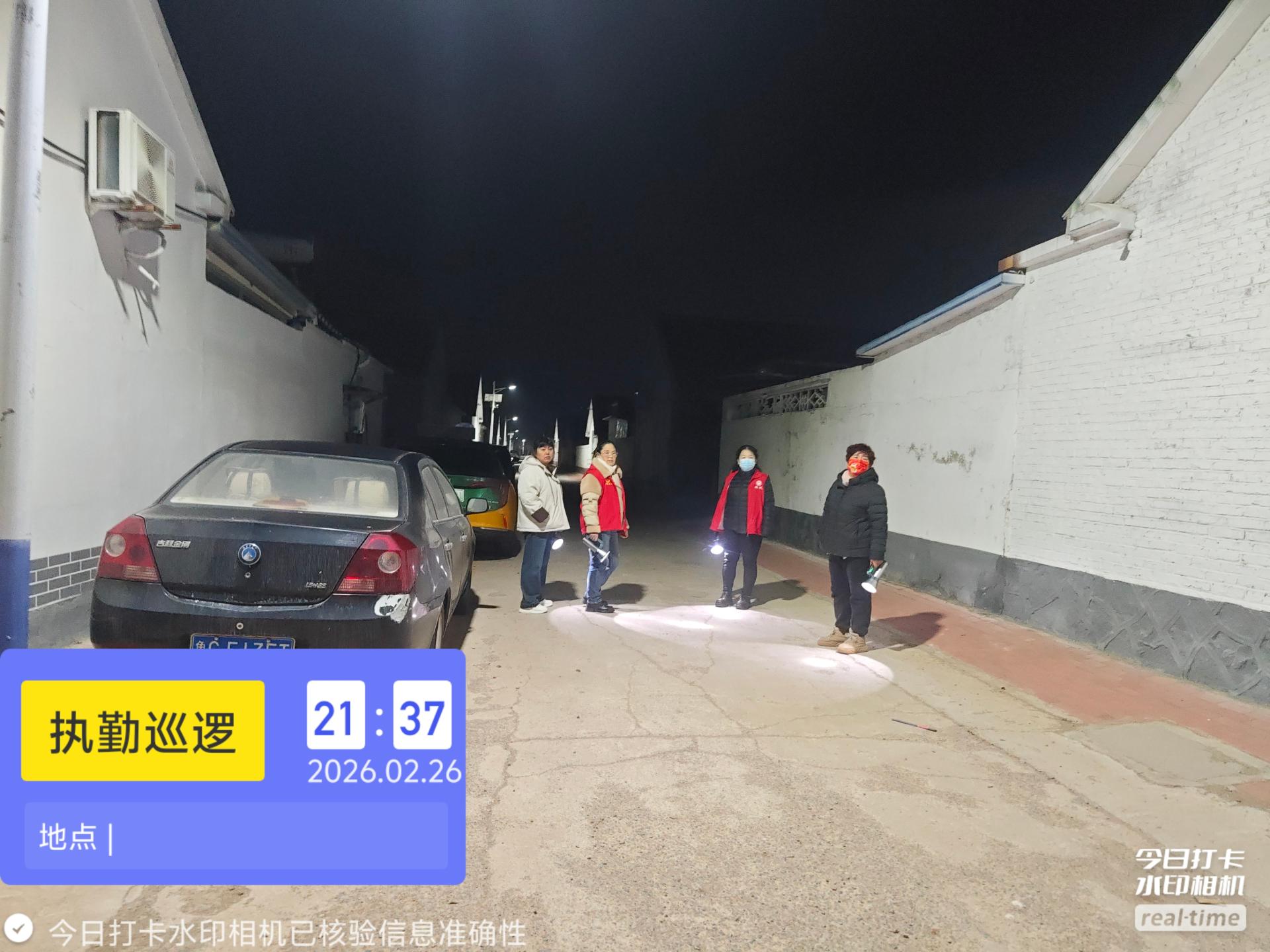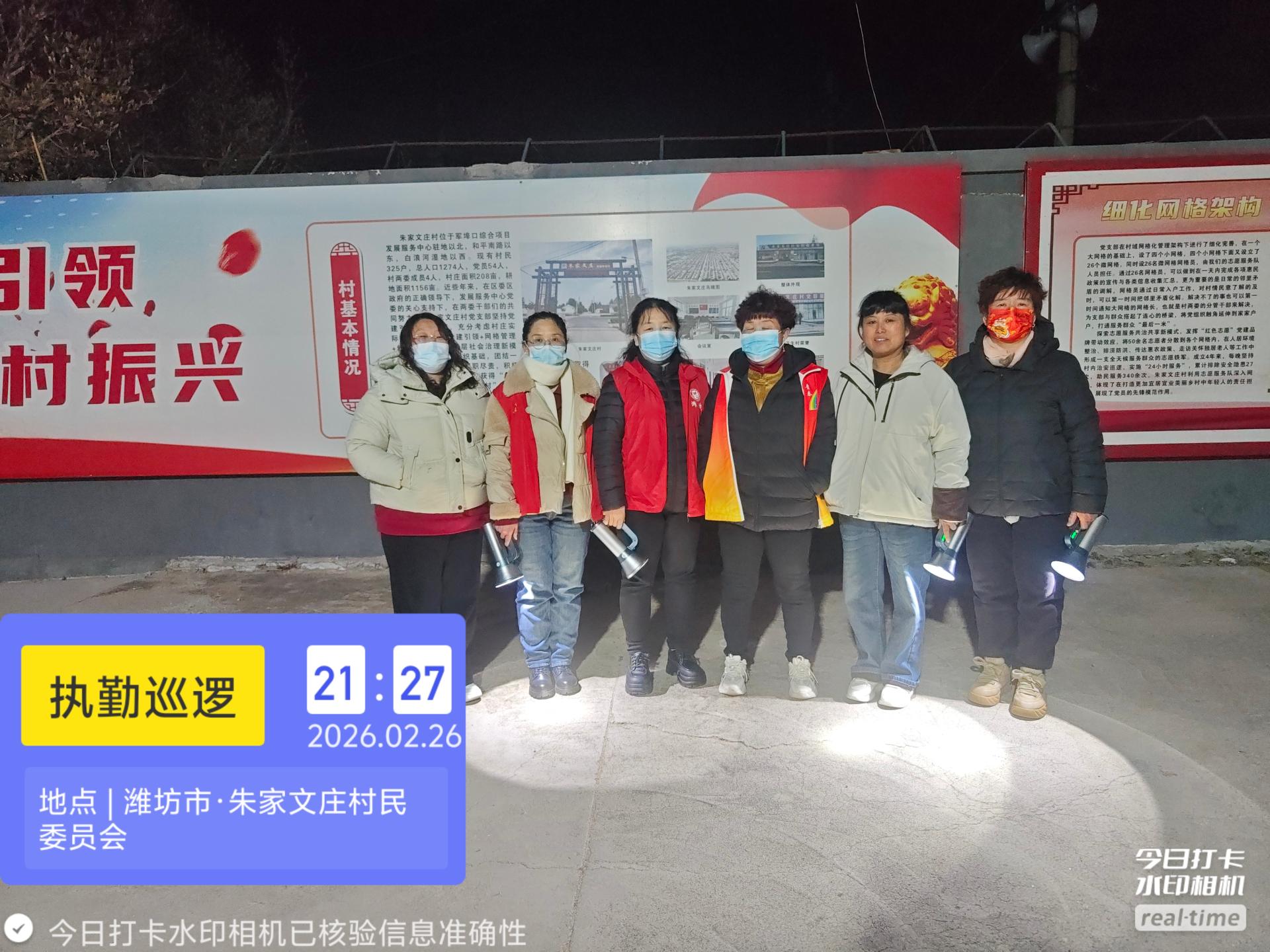 19:30-22:30朱家文庄村志愿服务队组织志愿者参与夜间值班巡逻活动,保障村民的财产和生命安全。