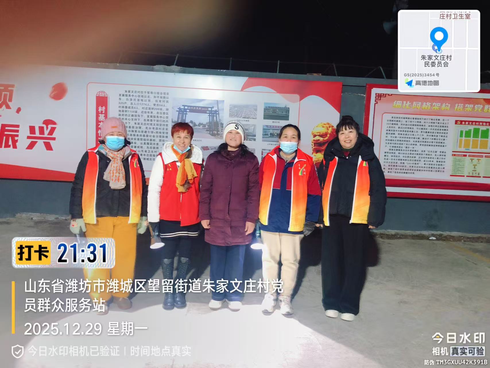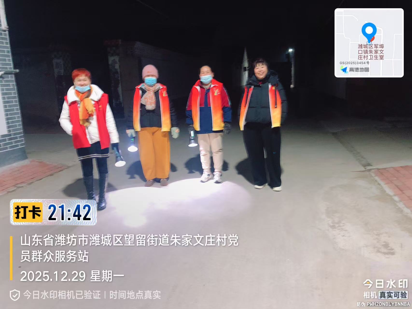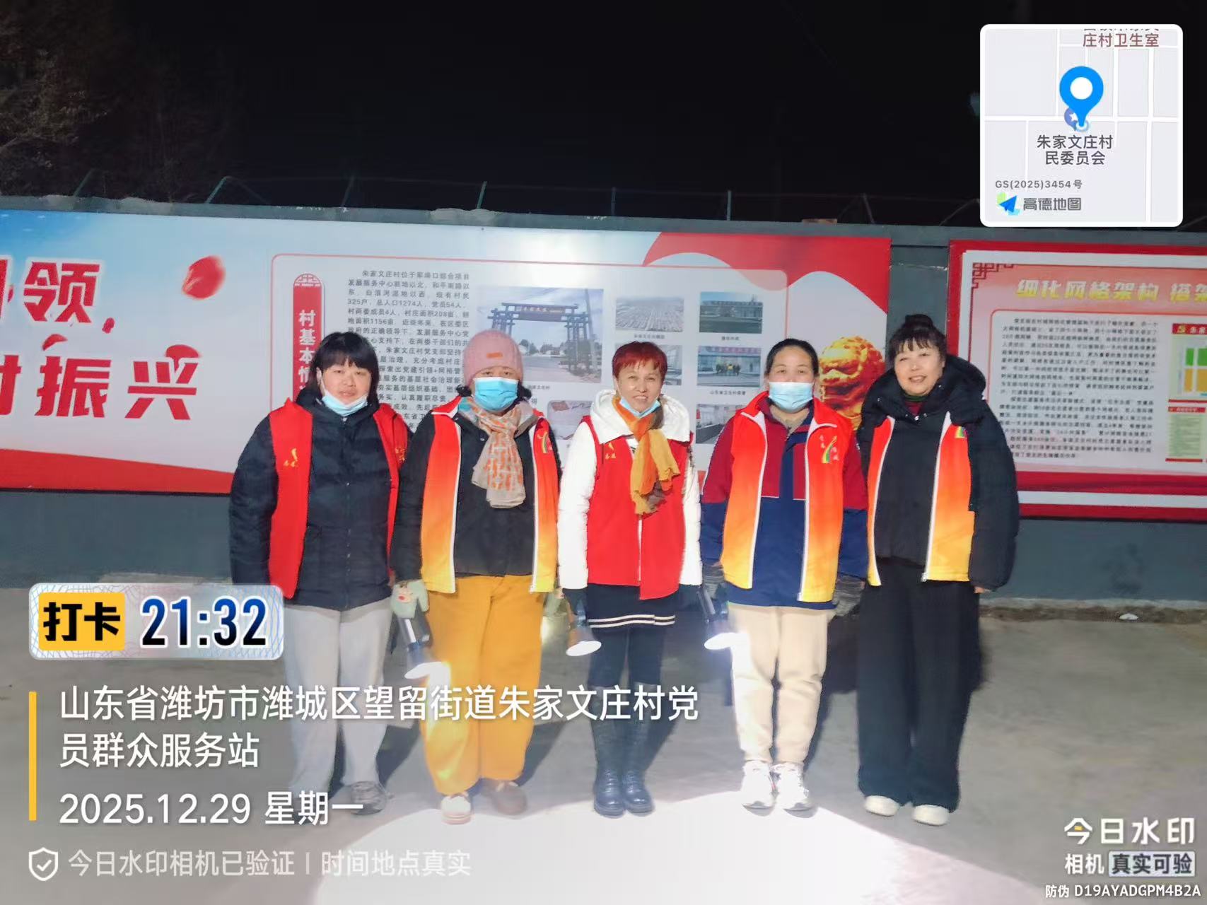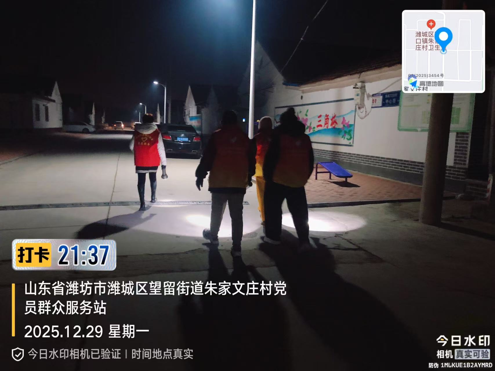 19:30-22:30朱家文庄村志愿服务队组织志愿者参与夜间值班巡逻活动,保障村民的财产和生命安全。