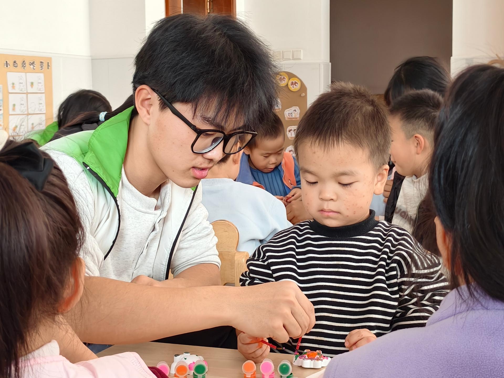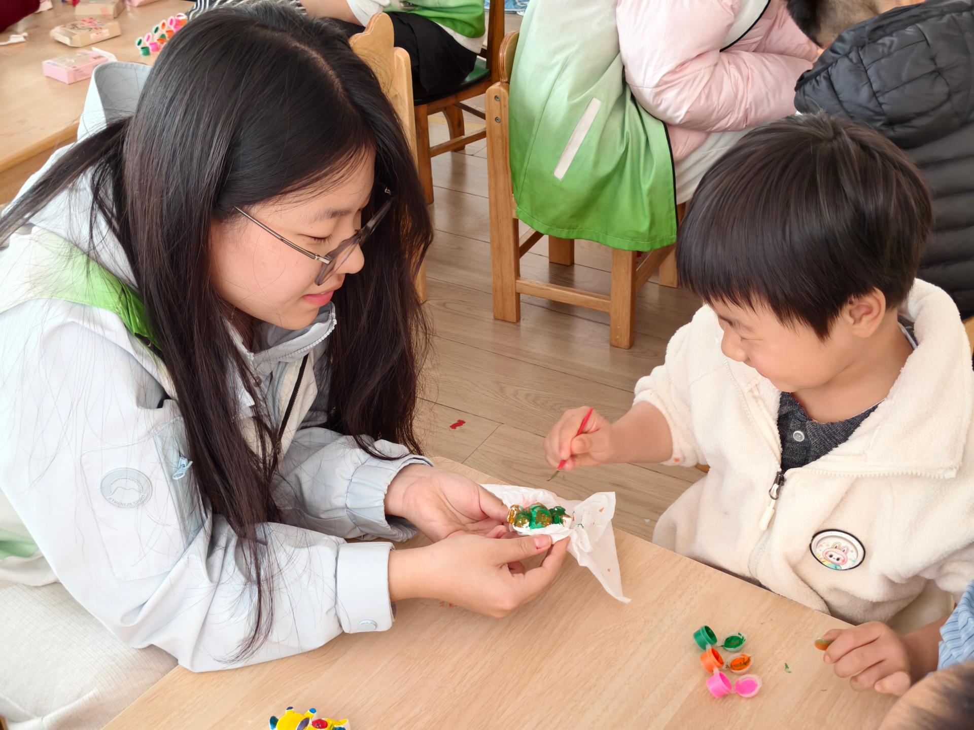 志愿者们前往大学城幼儿园布置活动场地,摆放好石膏娃娃、绘画工具和材料等。志愿者现场进行石膏娃娃绘画示范,讲解绘画的基本步骤和技巧,如如何调色、如何涂色均匀、如何避免颜料弄到衣服上等。小朋友在志愿者的陪伴和指导下,自由发挥想象力,进行石膏娃娃绘画创作。待小朋友们制作完成,志愿者们陪同小朋友们上台展示,并给予鼓励支持。