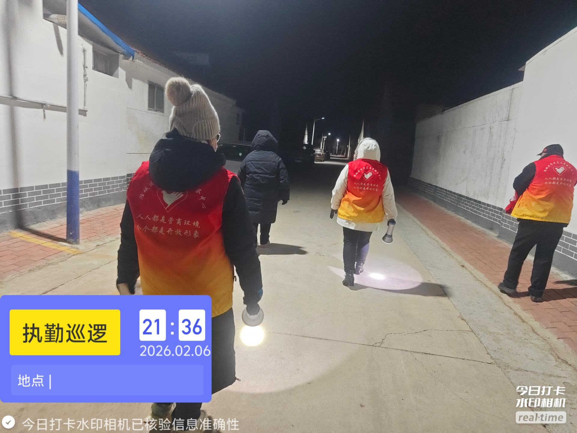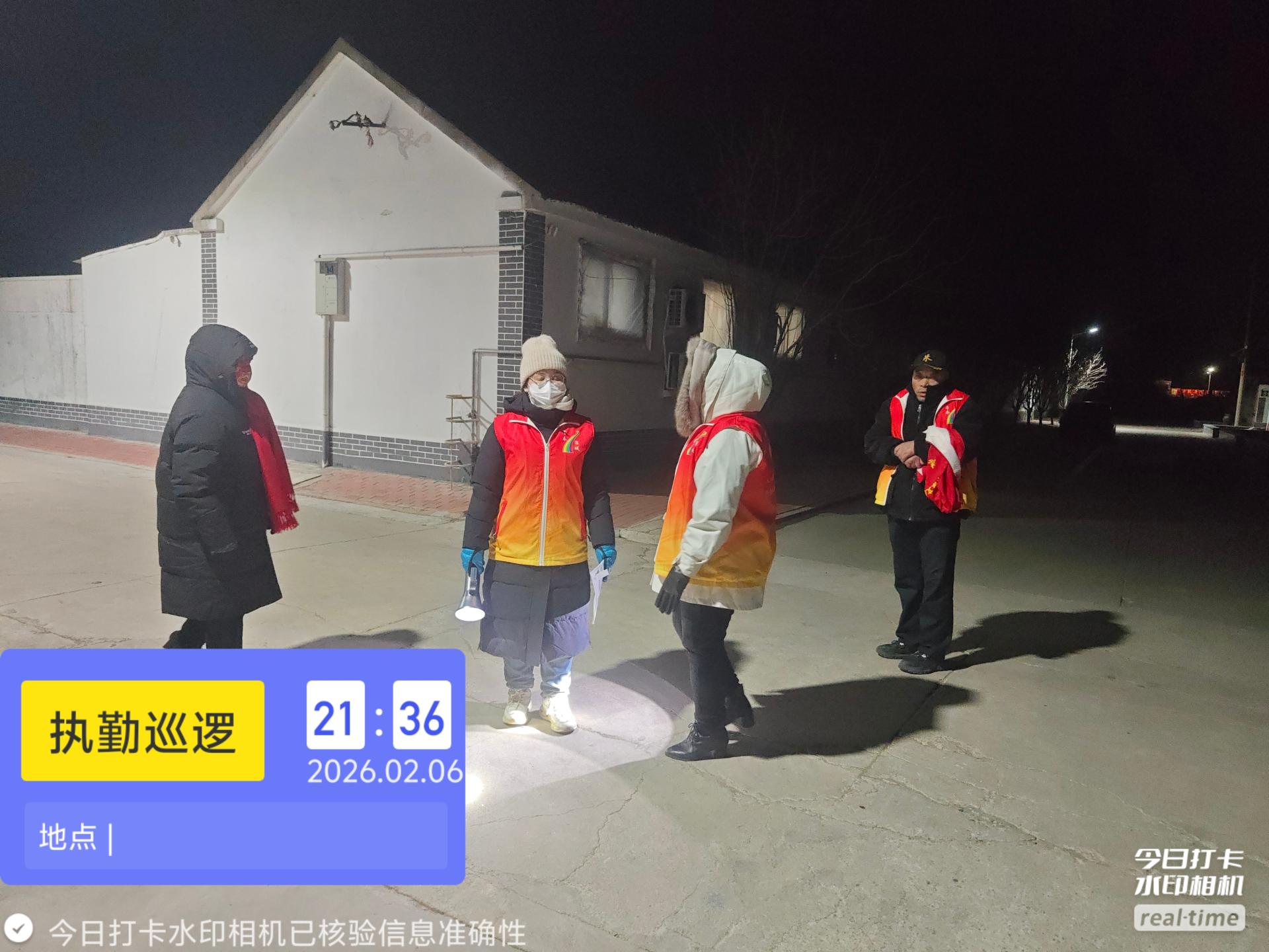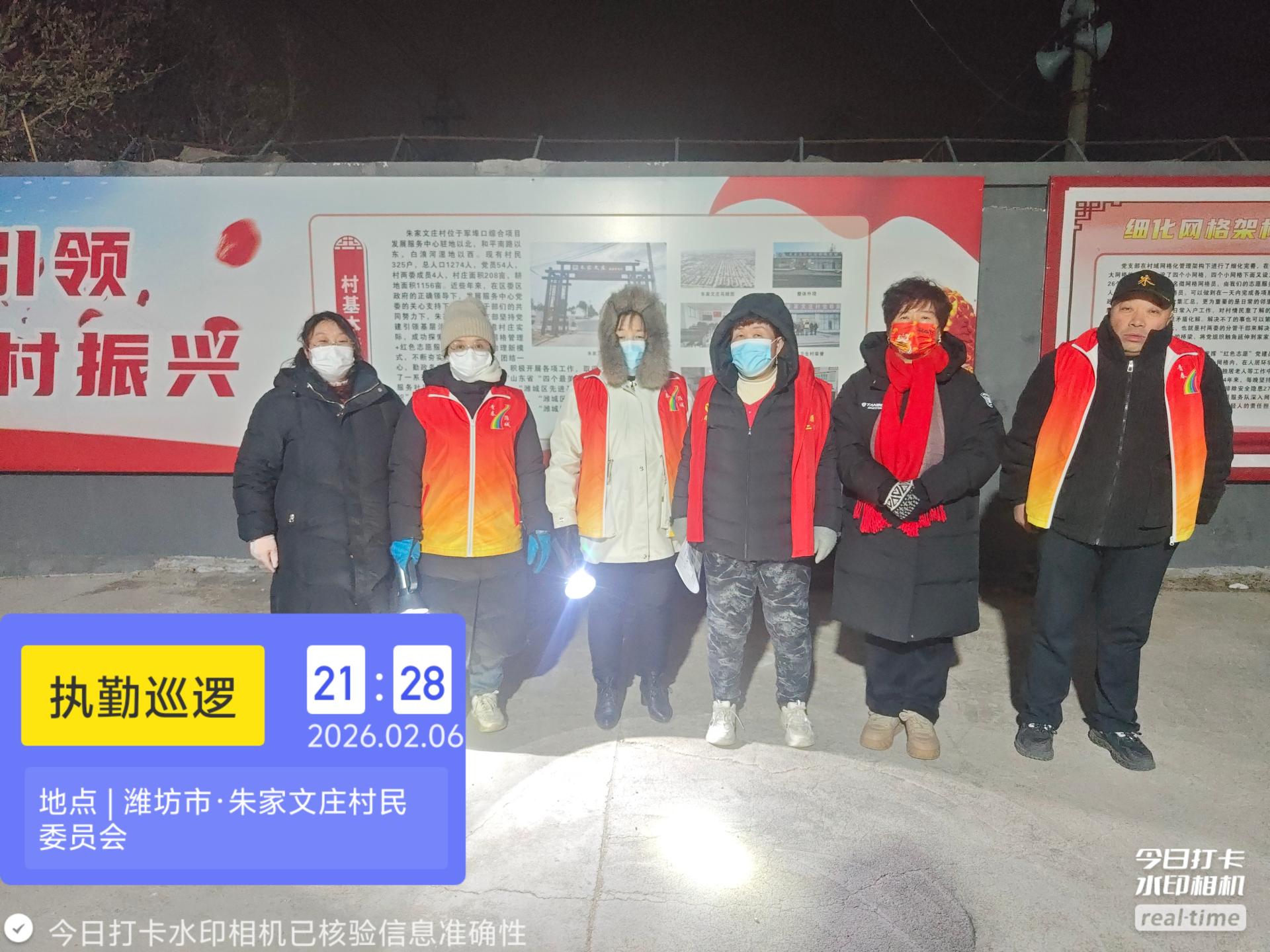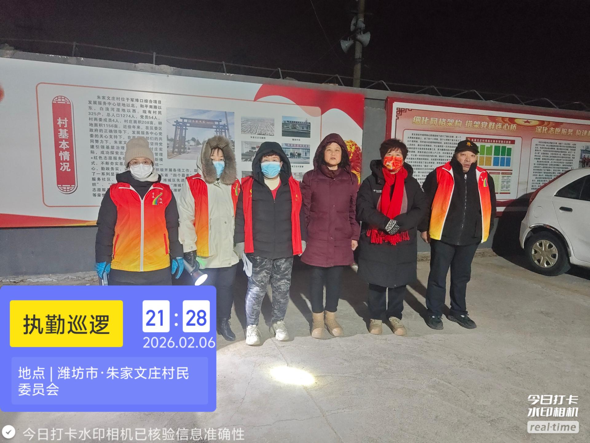19:30-22:30朱家文庄村志愿服务队组织志愿者参与夜间值班巡逻活动,保障村民的财产和生命安全。