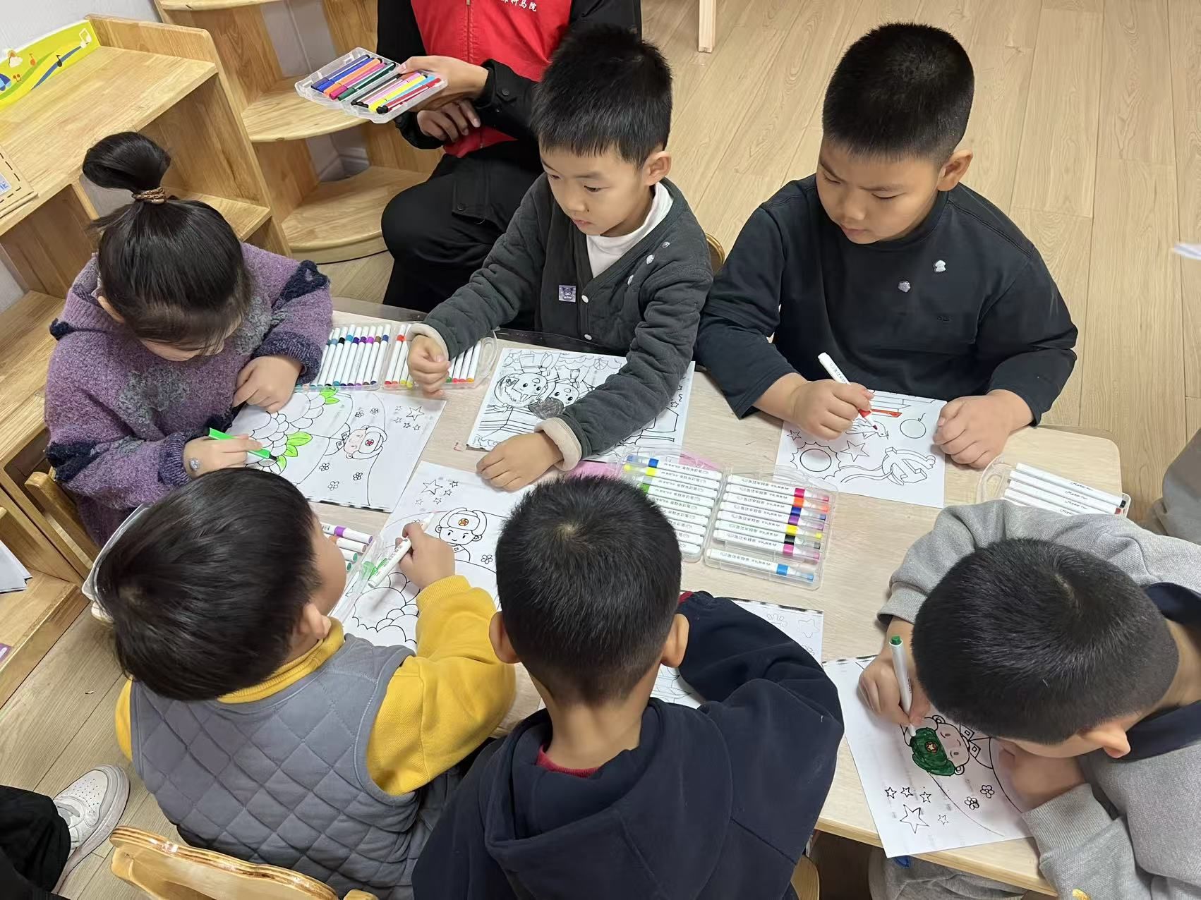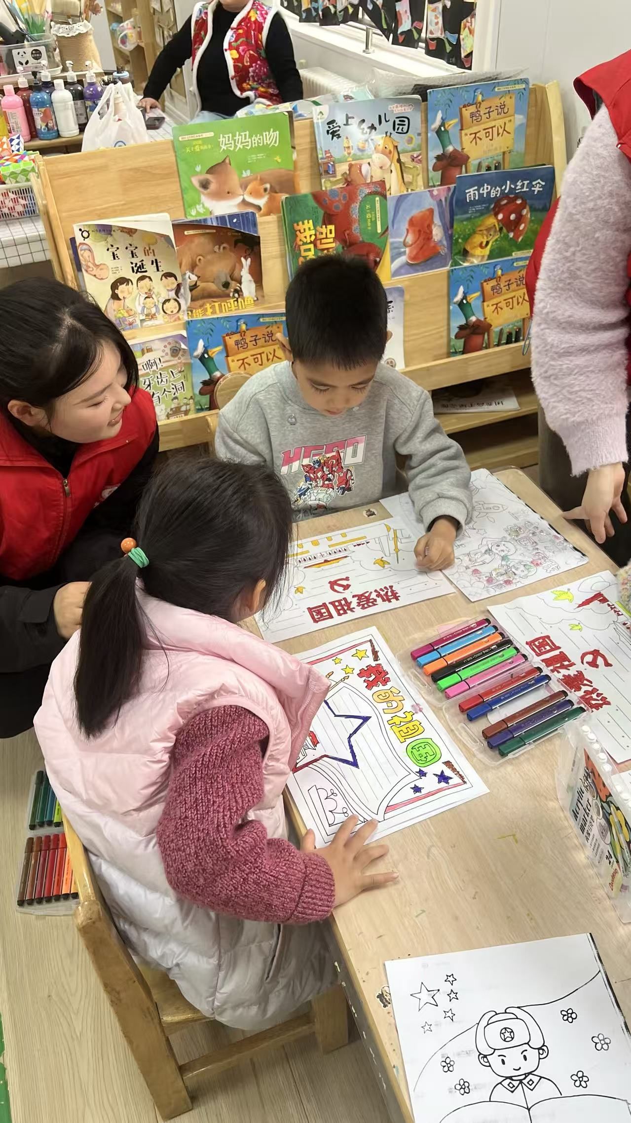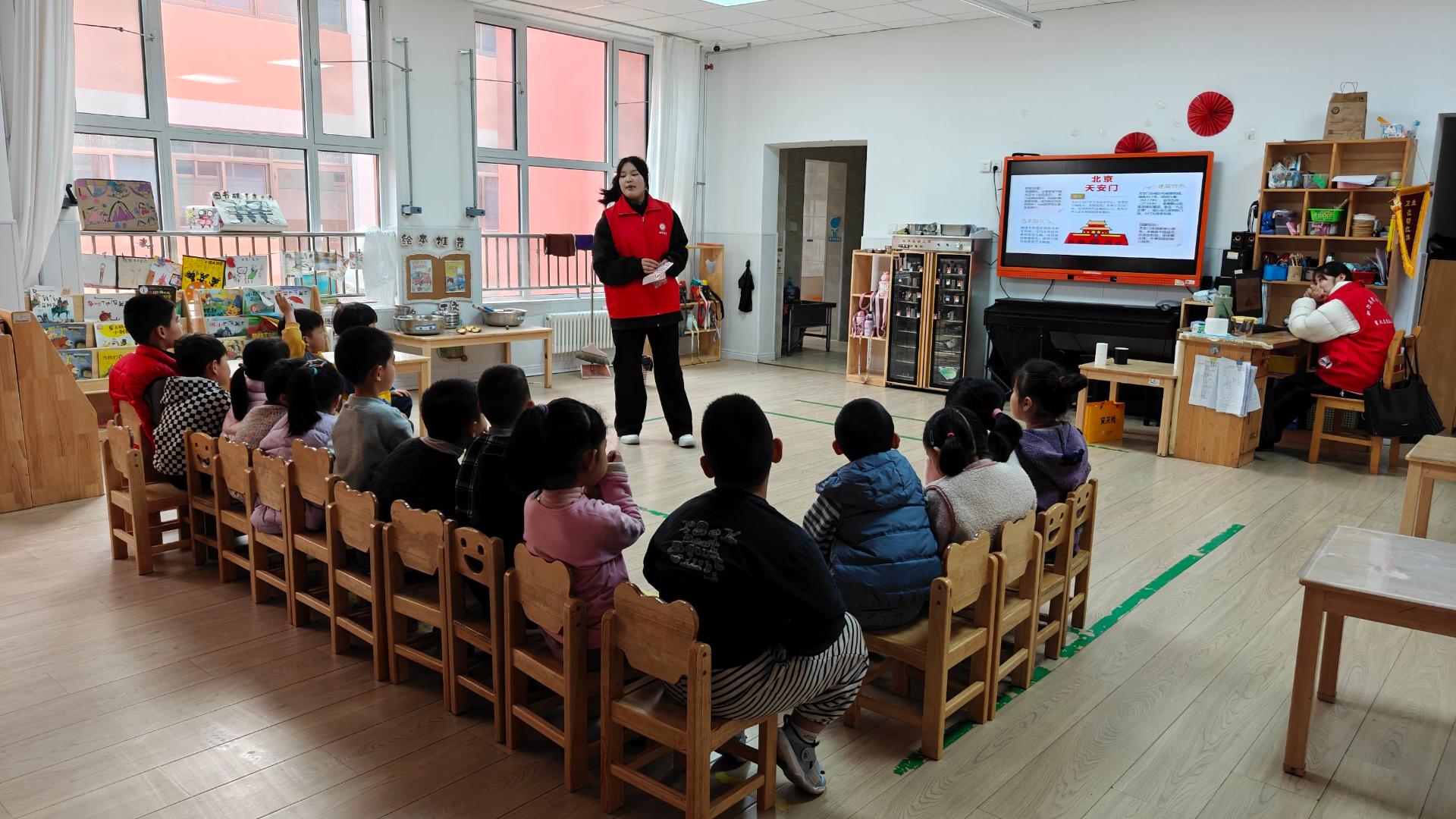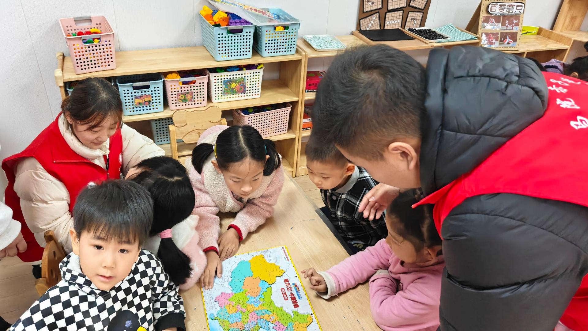 志愿者借猜猜看引出红色标识,用PPT讲解国旗等符号的意义,讲述红小丫坚韧长征的故事并介绍中国地图,再组织小朋友分组完成拼地图等任务,锻炼小朋友动手与表达能力,将红色文化融入趣味活动,让红色精神潜移默化浸润童心,最后邀请小朋友分享作品并合影