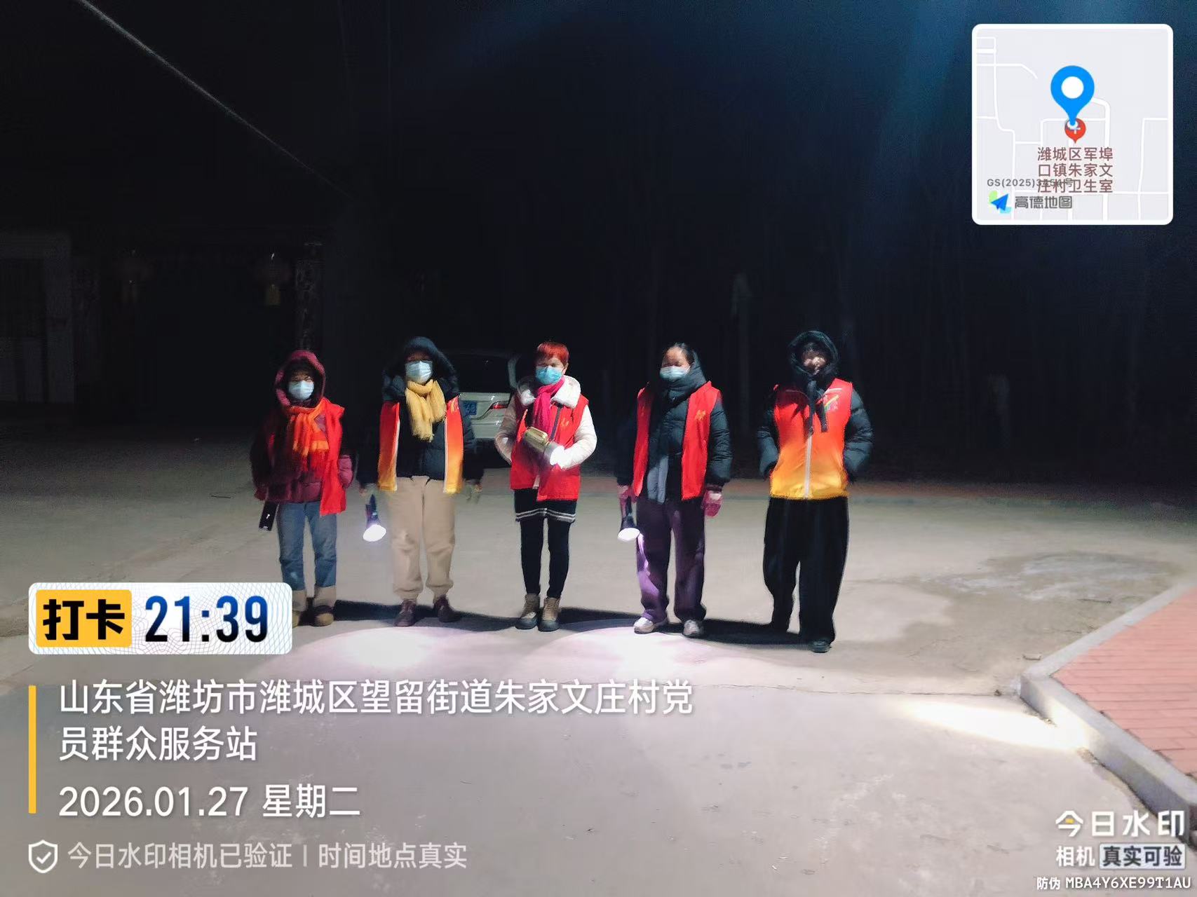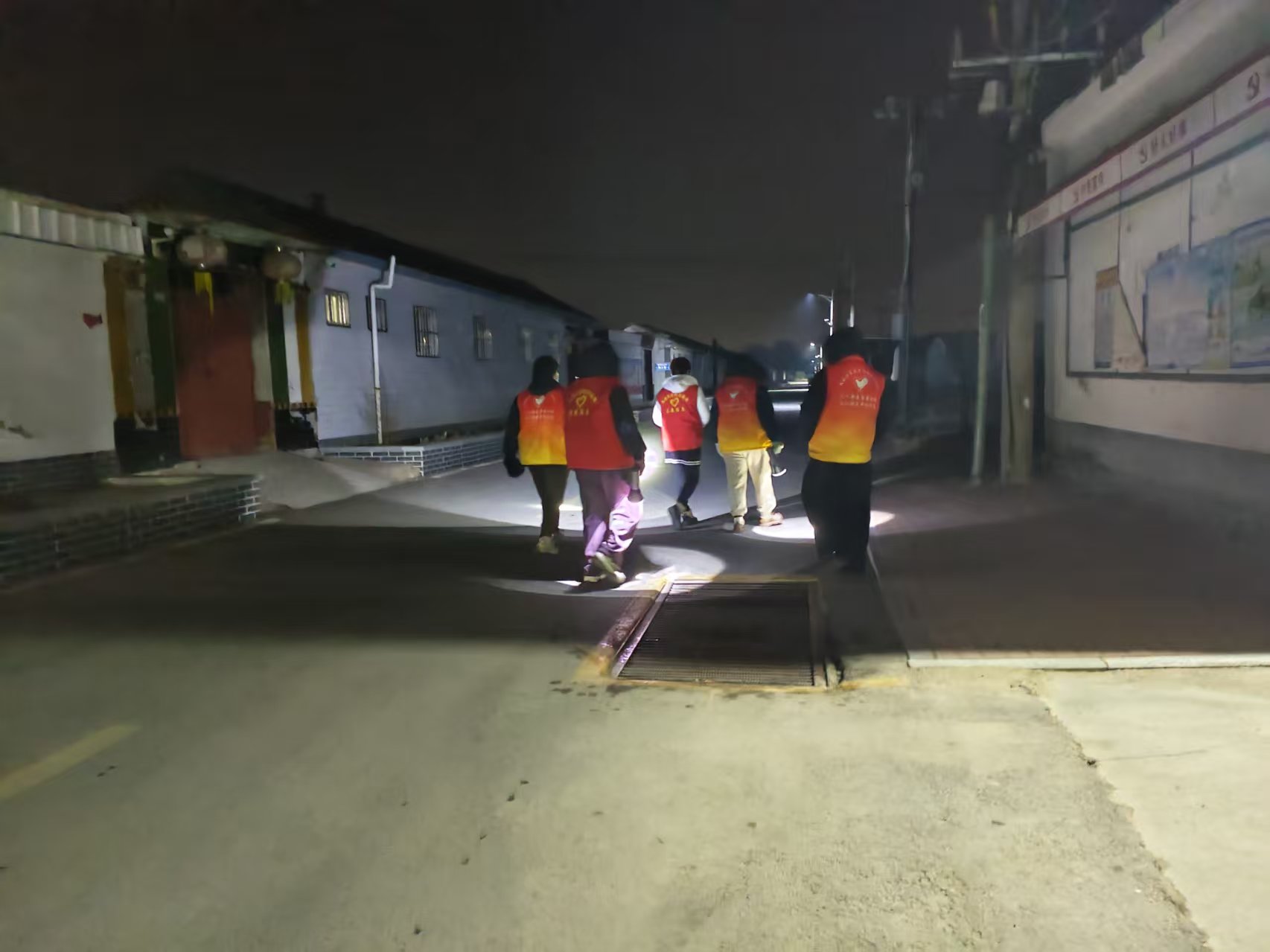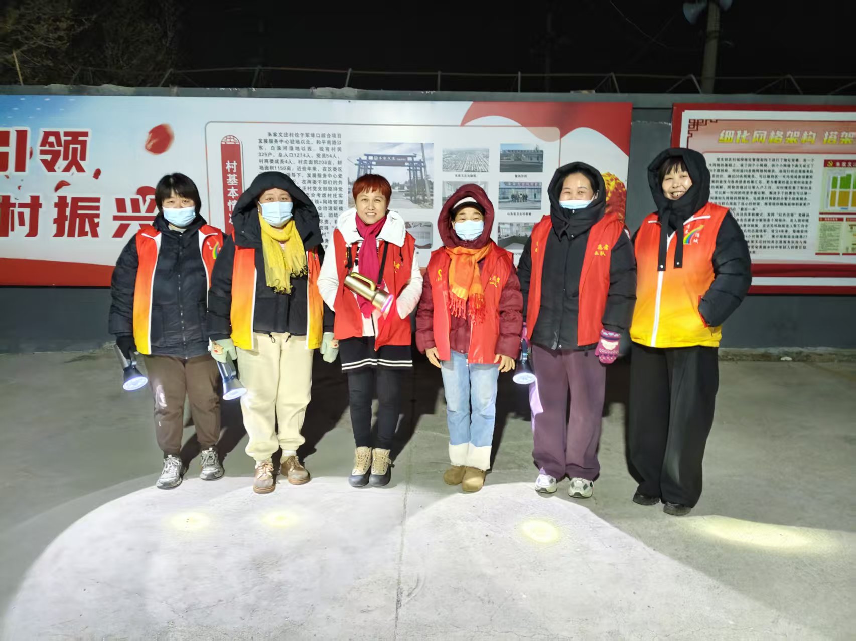 19:30-22:30朱家文庄村志愿服务队组织志愿者参与夜间值班巡逻活动,保障村民的财产和生命安全。