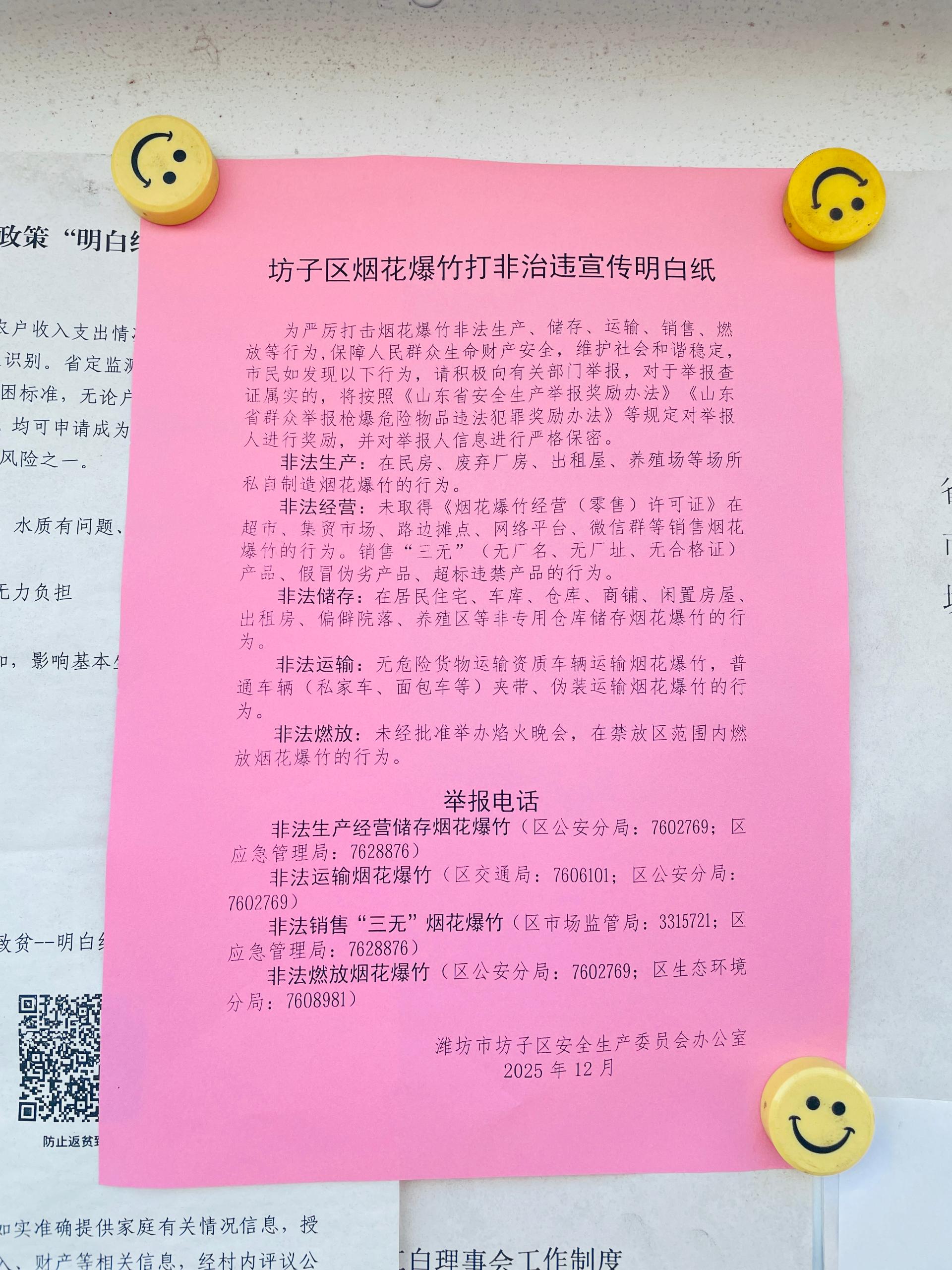 为严厉打击烟花爆竹非法生产、储存、运输、销售、燃放等行为,保障人民群众生命财产安全,维护社会和谐稳定,马司一村组织村两委和新时代文明实践站 志愿者,共同开展烟花爆竹打非治违宣传,通过张贴明白纸、微信发群、入户发放明白纸等方式。