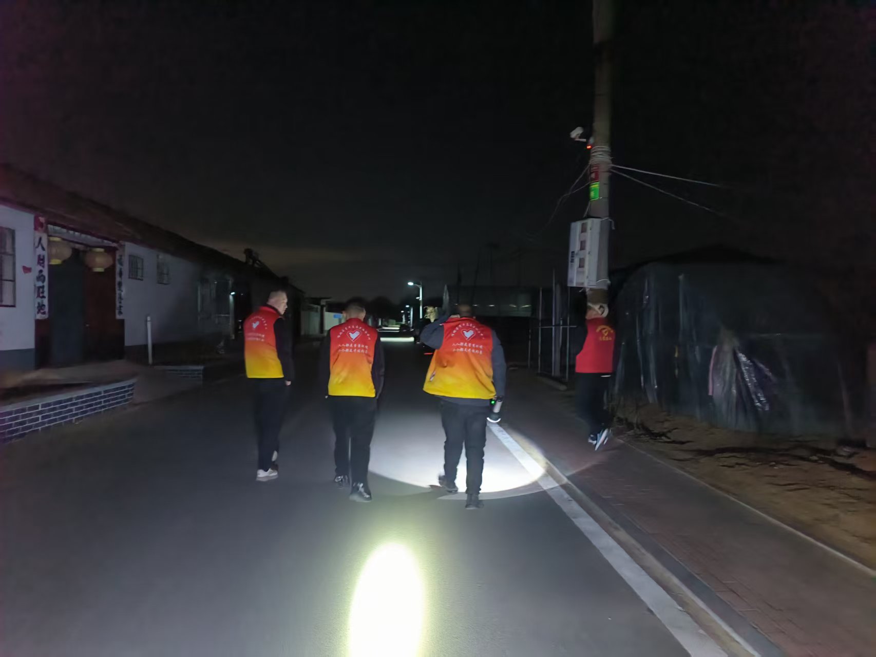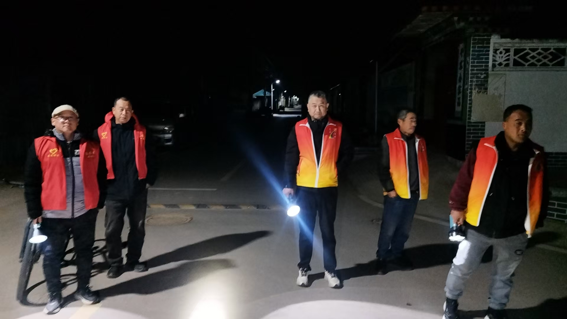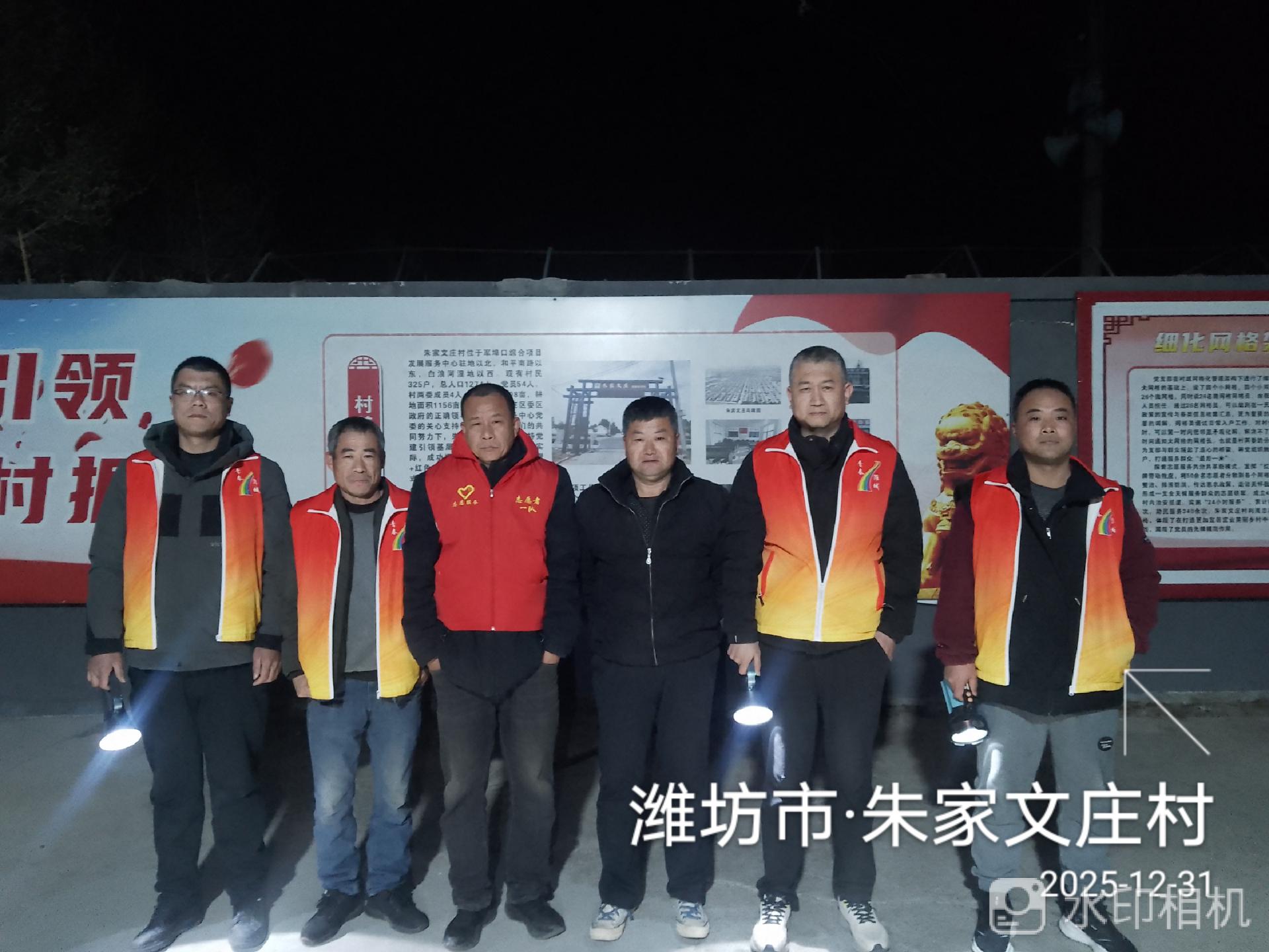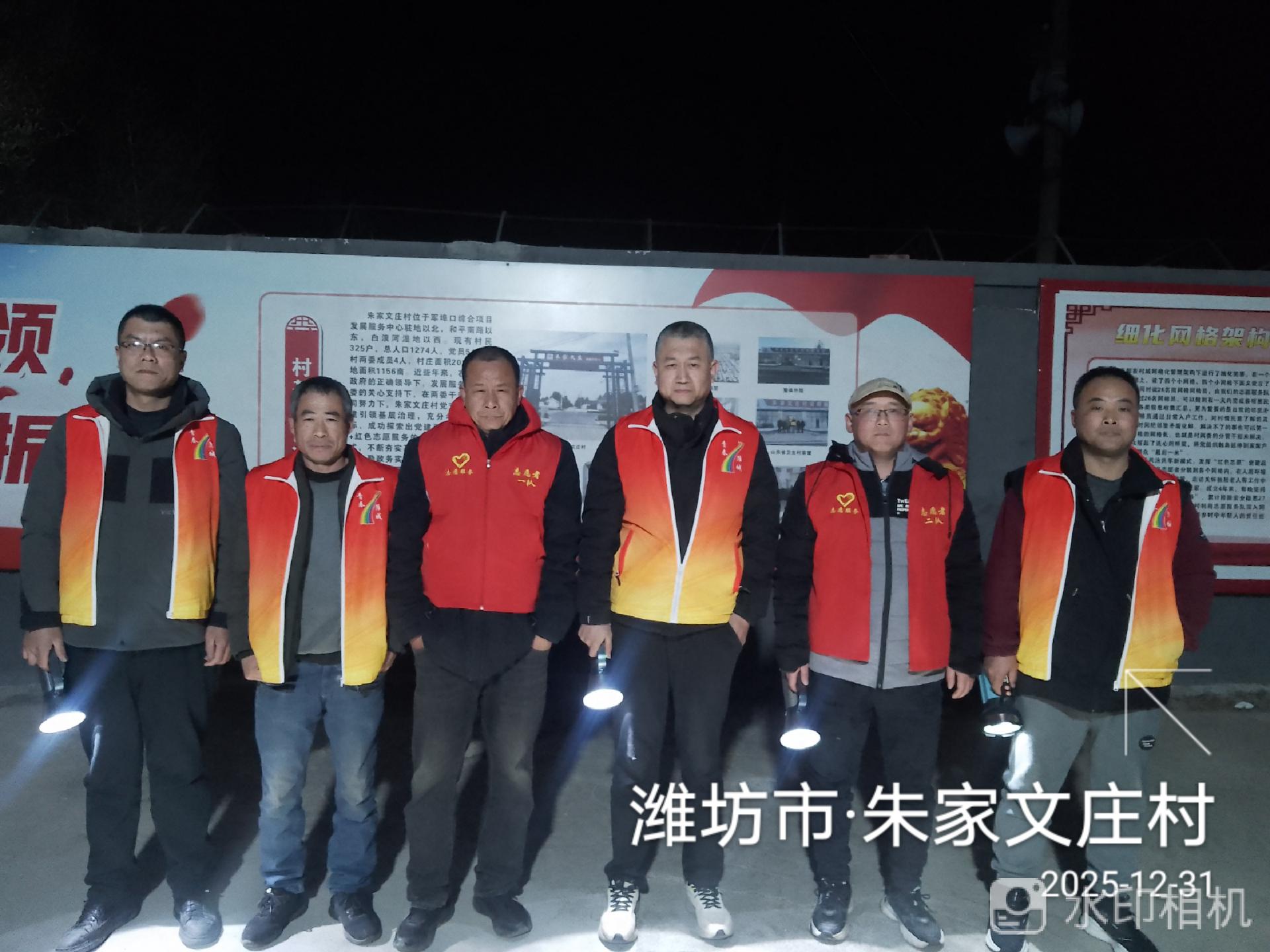 19:30-22:30朱家文庄村志愿服务队组织志愿者参与夜间值班巡逻活动,保障村民的财产和生命安全。