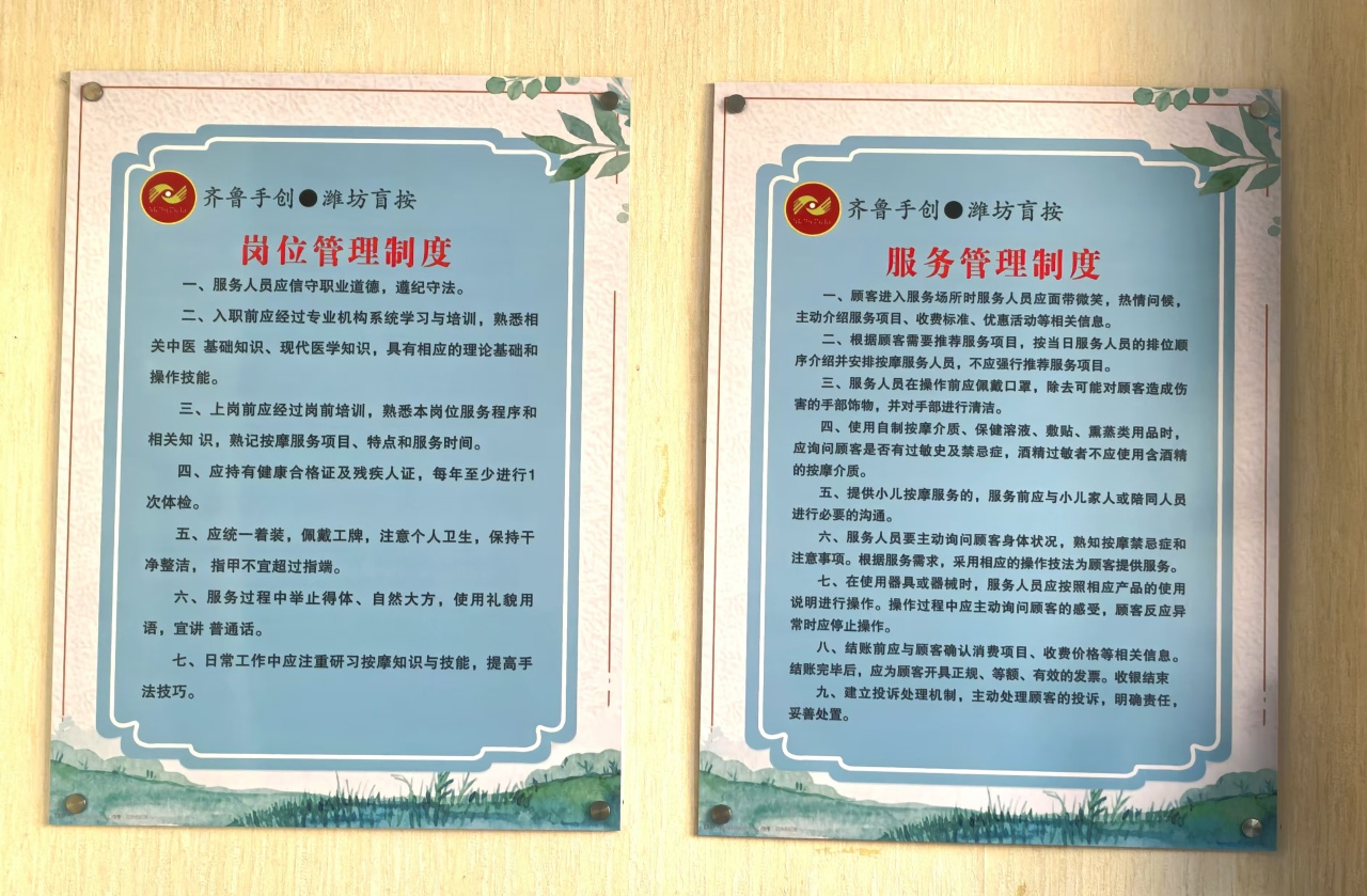 “齐鲁手创”品牌项目,是针对盲人按摩行业发展提出的标准化品牌建设项目。今年以来,坊子区残联按照山东省残联和潍坊市市残联“齐鲁手创”的创建要求,积极推进盲人按摩标准化品牌建设,按照“六统一”标准,不断提升盲人按摩人员从业水平和综合能力,改善和加强盲人按摩机构内部管理,促进行业规范化、专业化、品牌化发展。