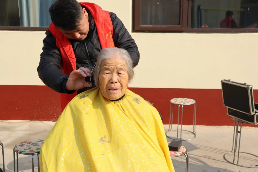 在院内的另一边,志愿者化身“爱心义剪员”,用一把椅子、一块围布、几件理发工具组成了一个临时理发区,老人们在引导下有序排队,等待着焕然一新的“发型时刻”。伴随着一道道咔嚓声,老人们原本有些凌乱的头发变得整齐利落,脸上洋溢着幸福的笑容。理完发后,志愿者递上镜子,大娘看着清爽的短发,连连点头称赞:“剪得真好,一下子感觉年轻了好几岁!”